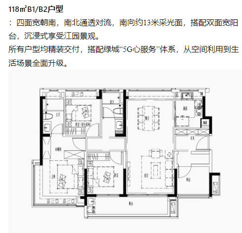 118平方米B1/B2户型:四面宽朝南,南北通透对流,搭配双面宽阳台,沉浸式享受江园景观。
