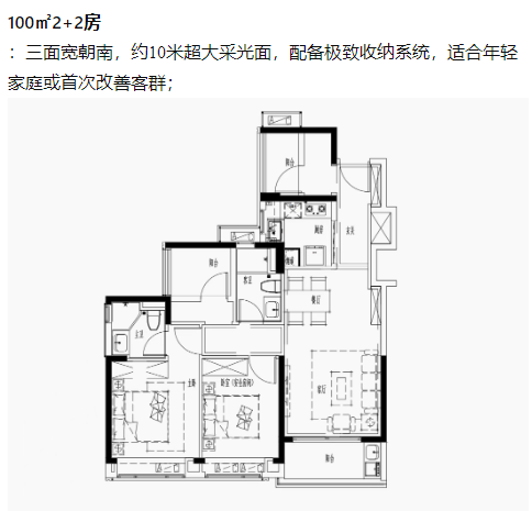 100平方米2+2房:三面宽朝南,约10米超大采光面,配备极致收纳系统。