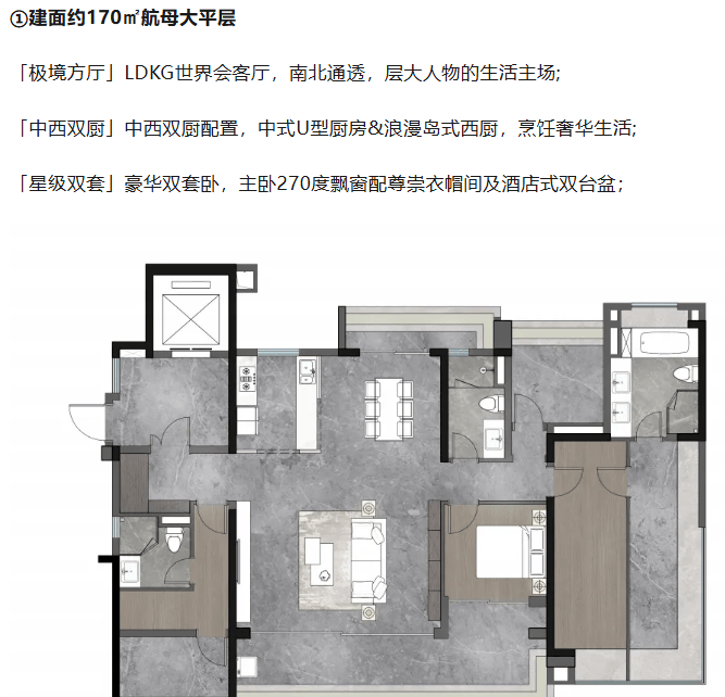 最后,关于产品的“全景舱”革新与全球一线品牌的“超标交付”,这是“誉”系基因的硬核呈现。我们提供建面约107至170平方米的纯粹板奢大平层,全系为新规产品,使用率高达约115%。户型设计以“全景舱”为理念,打造LDKG一体化世界会客厅,实现极境方厅与超大面宽。在交付标准上,我们秉持“超标”原则,全球臻选汉斯格雅、博世、西门子、弗兰卡等一线品牌,从厨卫设备到五金细节,均以顶豪标准进行配置。我们致力于呈现的,是一件经得起全球眼光审视、能够承载家族世代生活的艺术藏品。