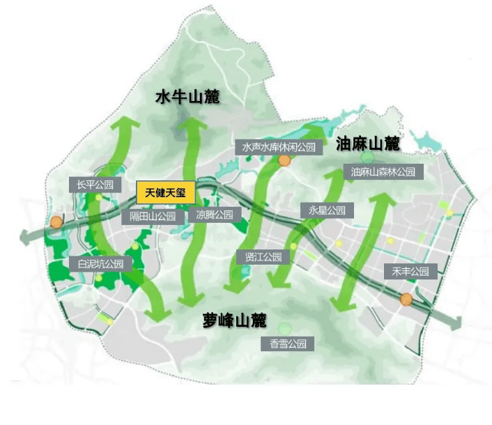 天健天玺是黄埔区少有的兼具山水资源与生态景观的住区,项目坐揽水牛山、油麻山、萝峰山三山环绕,形成天然生态屏障,隔绝城市喧嚣。同时,项目也是黄埔唯一被万里碧道、运动公园、山水间生态公园三公园环绕的小区,生态环境得天独厚。