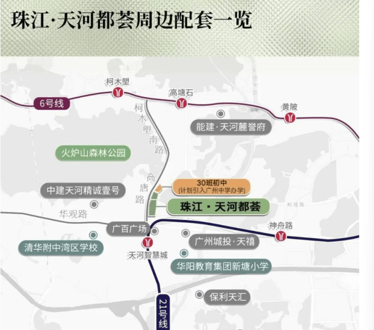 交通配套:地铁加持,纵横全城 交通是衡量一个楼盘价值的重要指标。珠江·天河都荟紧邻地铁21号线天河智慧城站,步行距离仅约600米,堪称真正的“地铁上盖”物业。