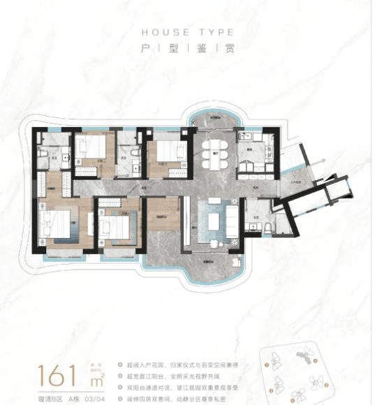3. 161㎡顶奢江景同堂大五房:专为多代同堂家庭设计,五房两卫布局,空间宽敞舒适。户型采用LDK(客厅、餐厅、厨房)一体化设计,增强家庭互动空间;多个卧室朝向江景,配备全景飘窗,尽享珠江美景;独立玄关设计,提升归家仪式感,同时增加收纳空间。