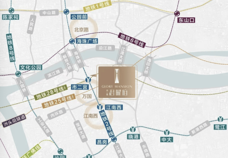 对于依赖公共交通的都市菁英而言,“真正的零距离地铁上盖”是无价的效率与舒适资产。市二宫·君曜府的核心王牌在于其“双地铁上盖”的顶级交通配置。项目与已开通的广州地铁2号线及在建的28号线(佛穗莞城际) 交汇站——市二宫站无缝接驳,直线距离不足200米,属于“下楼即地铁”的终极便利。乘坐2号线,可一线直达海珠广场、公园前、纪念堂、越秀公园、广州火车站等核心枢纽与行政区,并迅捷换乘通往珠江新城、琶洲、广州南站。未来28号线这条湾区东西大动脉开通后,可3站迅达琶洲,快速连接佛山、东莞,价值能级将再次跃升。这种“双地铁交汇、一线通全城、接驳大湾区”的黄金轨道配置,是项目作为“轨道核心资产”最硬核的支撑,完美覆盖了通勤、商业、文旅的全场景出行需求。