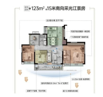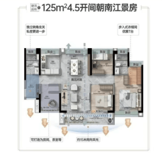 建面约125㎡王牌户型:4.5开间朝南+15米采光面,主次卧双南向。