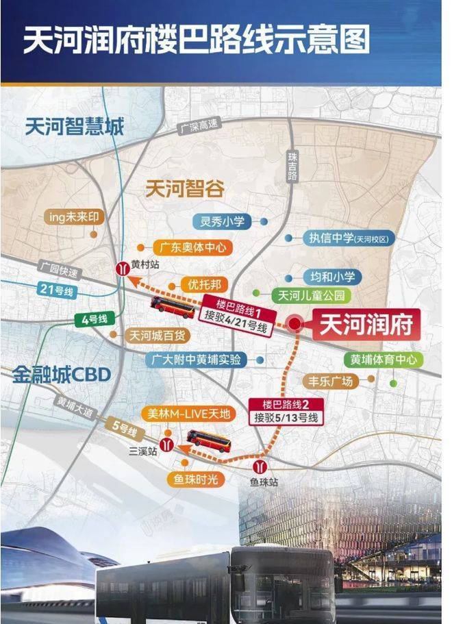 在交通方面,天河润府为业主提供了极为贴心便捷的出行条件。作为市中心首个配套楼巴且从交付起 5 年业主免费使用的社区,根据业主出行路线定制了两条楼巴路线。路线 1 直达奥体中心,接驳地铁 4/21 号线黄村站,可通达天河东与黄埔核心区域;路线 2 直达鱼珠 - 三溪商圈,到达地铁 5/13 号线鱼珠站,实现 3 站到金融城,7 站到珠江新城,极大地方便了业主前往城市重要区域的通勤和出行。此外,项目与琶洲商圈距离约 10 公里,在非高峰时段,驾车前往金融城、琶洲、珠江新城等重要商圈仅需 20 分钟左右,自驾出行较为便捷。同时,项目还将配建一个公交站场,方便片区居民出行,华润置地配建规划道路并拓宽茅岗路北延段,由原来的单向 2 车道拓宽成 40 米双向 6 车道,计划 2025 年完工,有效缓解了进出不便的难题,进一步提升了交通的便利性和通达性。