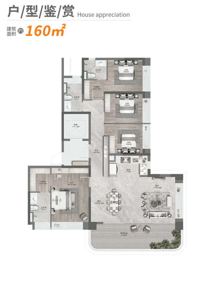 160㎡四房:270°观景端厅,约8米面宽阳台,主卧带独立衣帽间及卫浴。