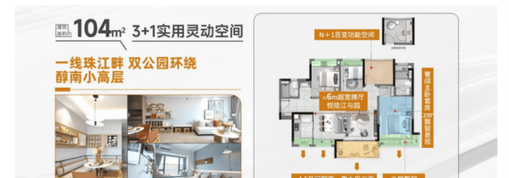 亮点:超大面宽,近100米珠江面宽(1#栋),阳台尽揽珠江美景。主卧套房设计,带独立卫生间和衣帽间,私密性极佳。