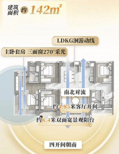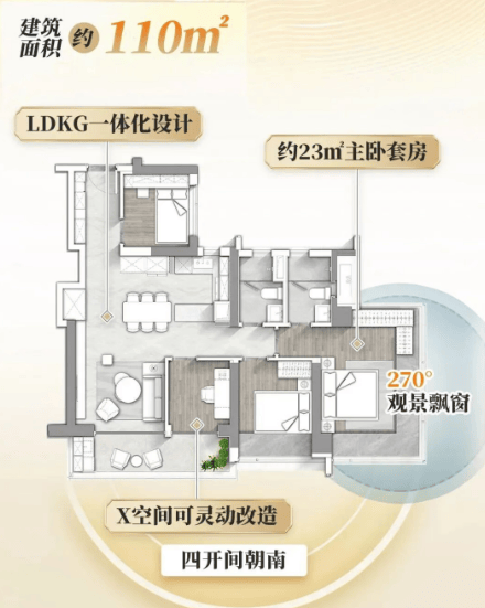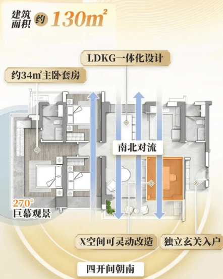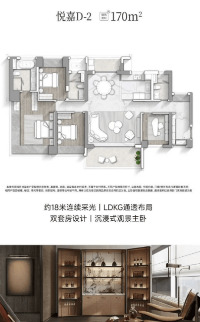 悦嘉D-2户型(建筑面积约170㎡):南北通透对流,四开间朝南,主卧套房面积约28㎡,配备无界视野沉浸式观景窗,半开放式中西厨,LDKG一体化布局,X空间灵动改造。