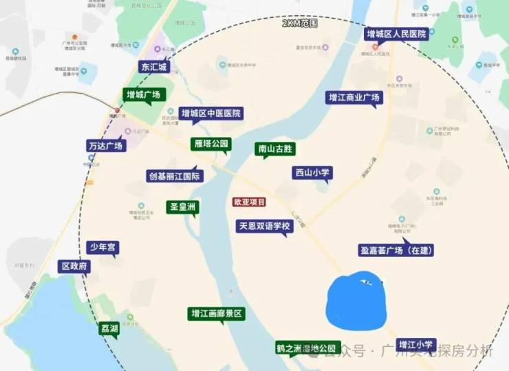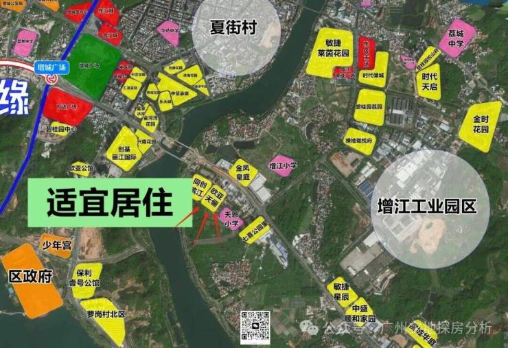 增城区域作为广州市东部发展的重点板块,近年来在城市规划中占据重要战略地位。欧亚天郦所在地理位置具备双重属性特征,即城市中心区位与临江环境资源的结合。项目临增江一线,享有长达15公里的江岸线景观资源,这种江景资源在大湾区一线城市中心城区内具有稀缺性。珠江水系作为自然生态屏障,不仅调节局部微气候,还提供视觉上的开阔感。楼盘东侧临近广汕公路交通干道,西面连接雁塔大桥,道路网络发达,驾车出行可快速通达穗莞深城市群。地铁21号线增城广场站距离项目约1.5公里,公共交通接驳便利,虽然不在站点正上方,但通过步行或短途接驳即可抵达。公交线路覆盖周边主要生活区,增强了出行的灵活性。地块本身经过多次规划调整,周边土地性质多为商住混合或纯居住用地,保证了社区周边的居住氛围纯粹性。项目北侧原珠江学院教学楼地块涉及城市更新改造,按照规划将拆除重建,未来周边天际线将更加整齐划一。