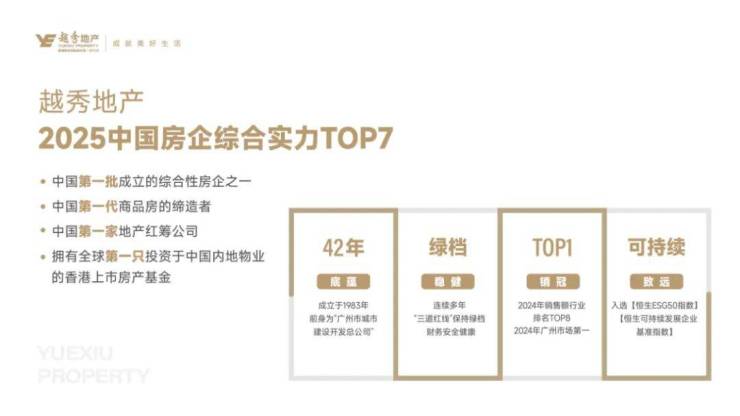 越秀地产成立于1983年,1992年香港上市(股票代码:00123.HK),是中国第一家上市房企。截至2025年,累计开发项目超200个,服务业主超100万人,2024年销售额突破1500亿元。其代表作包括珠江新城IFC、琶洲南TOD、二沙岛别墅群等城市地标,均以超预期品质重新定义区域价值。