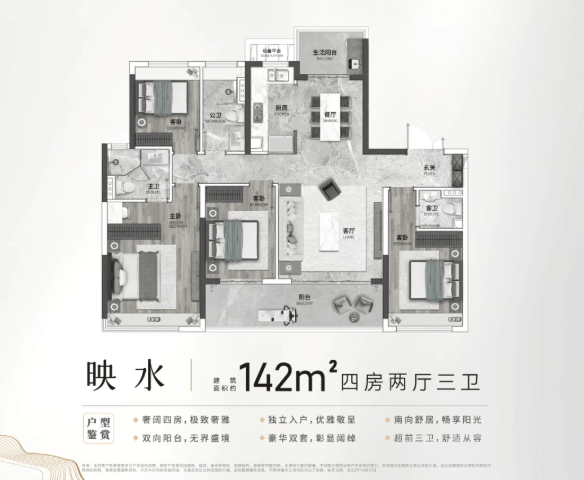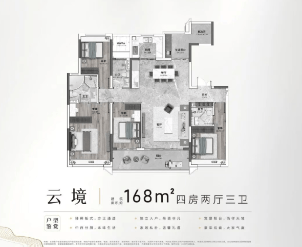此外,项目二期还推出了建面约106-174㎡的纯大平层产品,包括约110㎡的三房两厅两卫、约134㎡的南北对流三房、约143㎡的一梯一户板式三房以及约174㎡的270°环幕景观四房。特别是174㎡的户型,拥有约6.6米+8.5米的IMAX级景观面,LDKB连通设计让空间感倍增,私家电梯入户更是彰显了主人的尊贵身份。