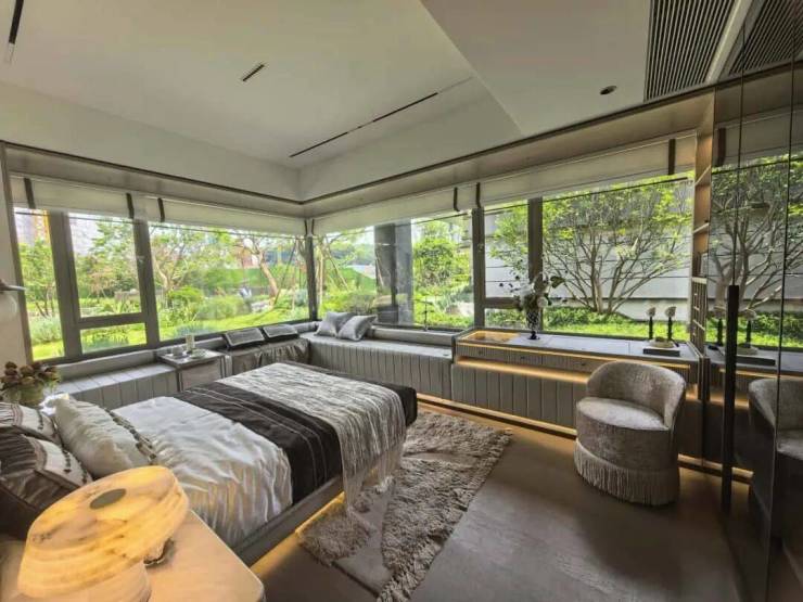 除了外部的湖景资源,项目内部的园林设计也极具特色。保利辰园湖境以岭南四大名园之一的余荫山房为灵感,打造“辰园十景”,通过借景、对景等经典造园手法,将湖光、园景、建筑融为一体,营造出“一步一景”的视觉体验。
