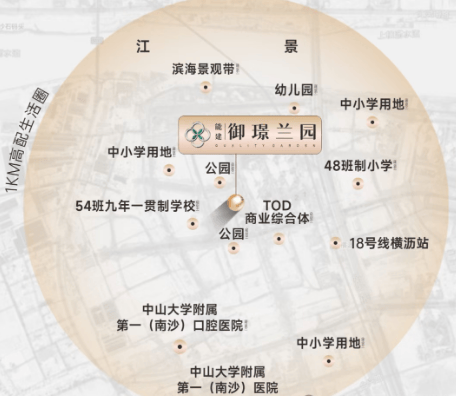 项目配建了一所幼儿园和一所48班的小学,并计划于明年开学;同时,还有一所九年一贯制学校正在建设中,预计后年开学。此外,周边还有湾区实验学校、广大附中南沙实验学校等多所学校环绕,形成了较为完善的教育体系。