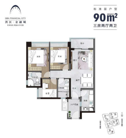 88平方米3+1室2厅2卫:罕见的紧凑四房设计,适合首次置业者或小家庭。