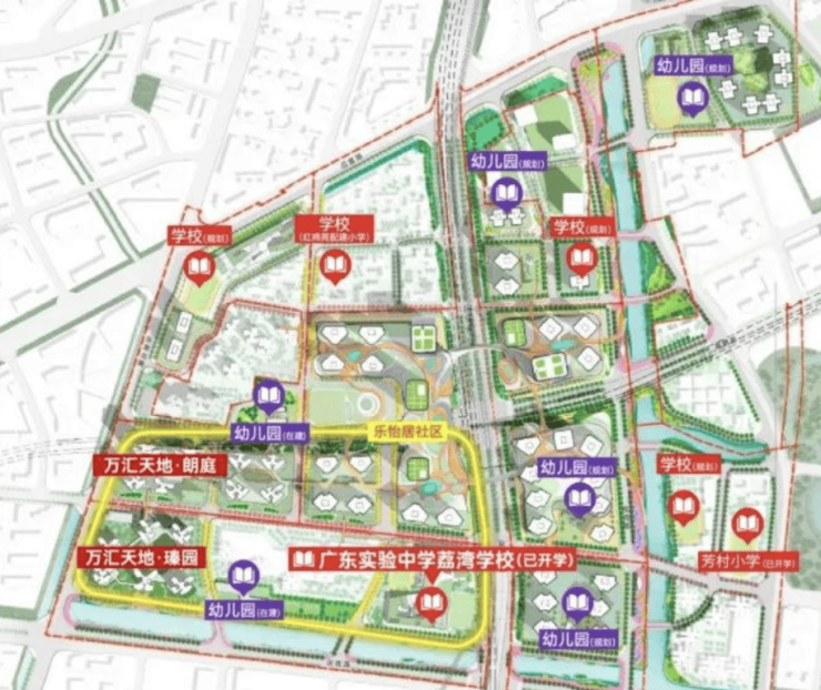 瑧园所在的花地湾板块配套体系完善,集教育、商业、医疗、公园等多元资源于一体。教育方面,项目自带九年制省实验学校花地湾校区,小学36班、初中18班,已于2023年9月开学。周边还规划有7所幼儿园、3所小学及3所中学,形成稳定优质的教育体系。商业方面,3大城市级综合体环伺——白鹅潭太古里、华润万象城及理想花地商业中心,未来将形成超百万平米的高端商圈,满足日常消费与社交娱乐需求。医疗资源方面,三公里范围内分布有多家甲级医院,其中荔湾区人民医院新院区预计今年底正式投入使用。休闲配套则以滨水公园为主,配有运动步道、口袋绿地及雕塑广场,形成一条城市生态长廊,让生活回归自然与健康。