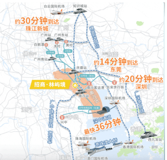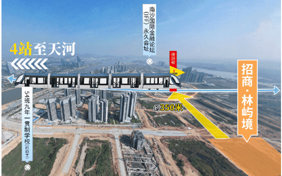 招商林屿境位于广州・国际金融岛・横沥地铁 E 口旁,距离地铁 18 号线横沥站仅约 350 米。通过 18 号线,24 分钟可到达万博商务区,37 分钟到磨碟沙,42 分钟到冼村。周边教育资源丰富,规划有小学 3 所、九年制学校 3 所等。中山大学附属第一人民医院(南沙院区)已运营,中山大学附属(南沙)口腔医院主体结构已封顶。还有南沙国际金融论坛(IFF)永久会址等配套。