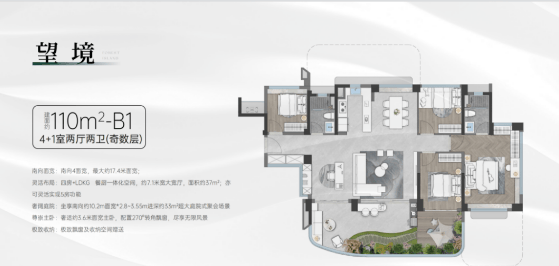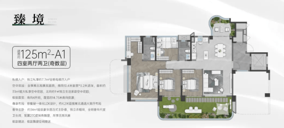 项目有 82㎡-110㎡-125㎡三至四房户型。82㎡奇数层户型为 3 房 2 卫,竖厅格局,客厅可与次卧打通,四开间朝南,空中花园面积达 20㎡,偶数层空中花园面积更大,有 24㎡。125㎡户型偶数层为公私双庭院,有约 30㎡公共入户庭院和约 11㎡私属空中花园,奇数层为南北双花园,南向约 33㎡私享空中花园。