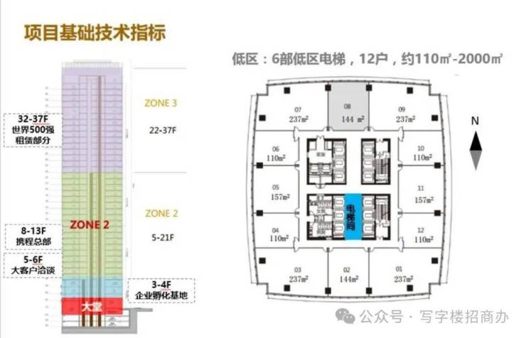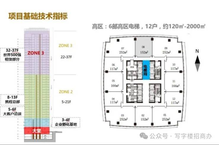 楼层与户型:写字楼共37层,提供了极为灵活的户型选择。主力户型面积从110平方米到252平方米不等,可以满足中小型团队、初创公司的需求。同时,项目提供整层约2100平方米的完整商务空间,为总部型企业、大型机构提供了旗舰办公场所。这种“大小通吃”的产品配置,让企业无论是起步、发展还是壮大,都能在这里找到合适的空间。