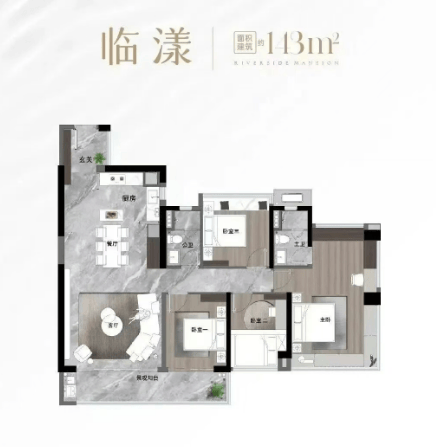 130㎡三房两厅两卫:全南向设计,3 梯 4 户配置,实测套内面积约 143㎡,客厅连接 7.2 米宽景阳台,望江面宽达 15 米,通过 LDK 一体化设计拓展公共活动空间,主卧配备步入式衣帽间,兼顾实用性与景观性。