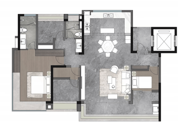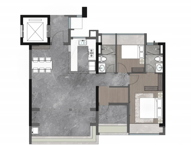 建面约143㎡:全景舱平层设计,配备奢阔通厅及中西双厨配置。