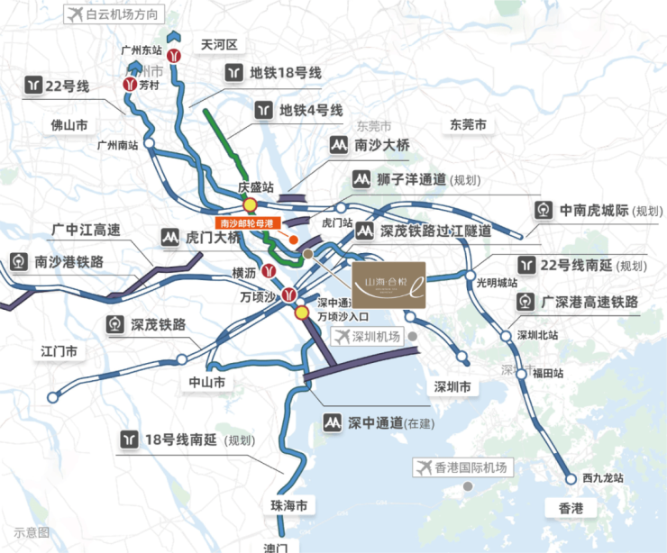 山海·合悦地处南沙湾三维交通枢纽,形成高速、地铁、轮渡及海航多模式立体出行体系。项目距离莞佛高速入口仅约1.5公里,车行3分钟即可上高速,10分钟直达东莞,约40分钟可通达深圳前海及广州核心商圈,成为湾区高效出行的桥头堡。地铁方面,项目距4号线、规划中的15号线及已通车的22号线南沙客运港站约900米,未来可30分钟直达广州中心区,两站换乘即可抵达深圳地铁网络,形成高效湾区通勤圈。轮渡出行仅需5分钟车程可达南沙客运港,实现广州直连港澳,海航方面距国际邮轮母港约800米,覆盖香港、日本及东南亚主要航线。项目周边五大国际机场均在一小时车程范围,交通便捷度高,实现海陆空多维度高效衔接,满足高端人士商务、出行及休闲多样化需求。山海·合悦 售楼处24小时电话400-6557-087(售楼部认证),预约专属顾问一对一服务,尊享内部折扣!