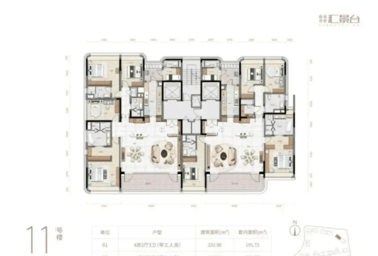 11栋:232-240㎡四房,实用率约83%,全南向设计,阳光全天候洒入每个房间。