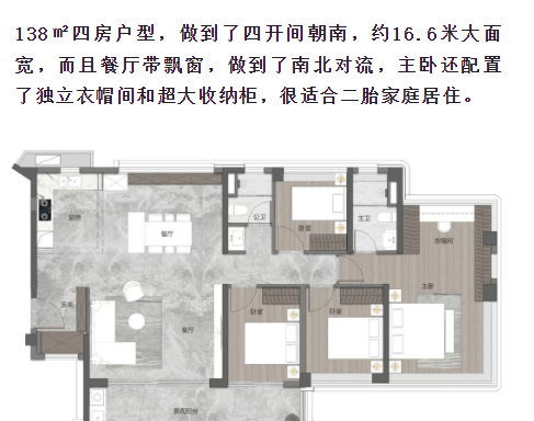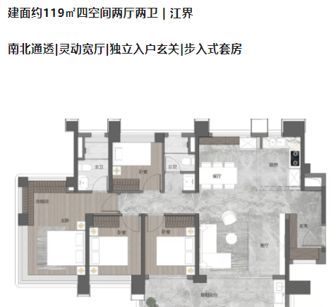 项目共 4 栋楼,首推 C1 栋。创新性地采用高低分区规划,以 60 米高度为界,低区(3 - 23 层)主打 90 - 160㎡的刚需及改善型产品,两梯四户,有建面约 96、119 平户型;高区(25 - 37 层)规划 120 - 190㎡的大平层江景豪宅,两梯三户,有建面约 135、160、195 平户型。95㎡四房南向看江景,主卧 270° 环幕大飘窗,采光与景观俱佳。135㎡户型南北对流,四开间朝南,采光面约 16.6 米,拥有园景与江景双重景观面。195 平户型更是惊艳,阳台长度约 8 米,LDK 客餐厅面积约 70 方,两侧观江面长达约 16 米,空间感十足。且项目作为新规项目,阳台占比高,实用率超 100%,产品竞争力强。
