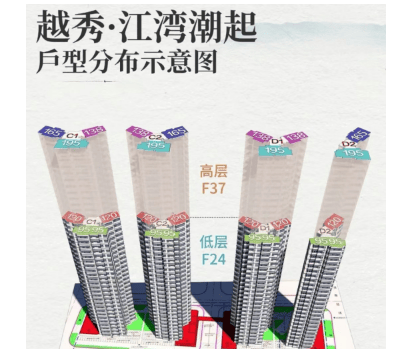 越秀・江湾潮起地块总用地面积 1.5 万㎡,计容建面 6 万㎡,绿化率 20.29%,容积率 4.17 。规划户数 443 户,总层高 37 层,车位数 733 个,车位比达 1:1.47 。产品面积段涵盖建面约 95 - 195㎡,梯户比为两梯三户或两梯四户,满足不同家庭结构的居住需求。