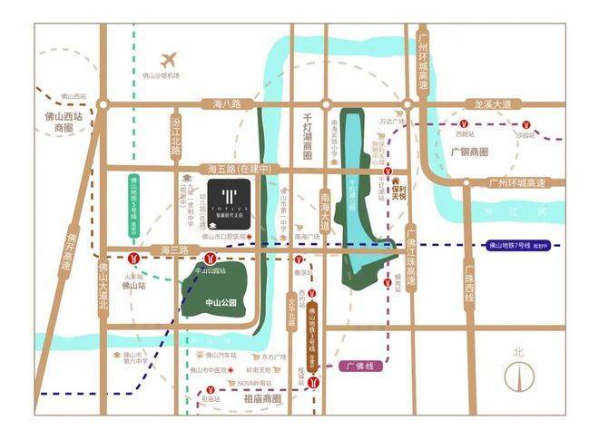 交通是项目的一大底牌。三地铁交汇格局已经成型,佛山地铁3号线中山公园站距离南侧约200米,预计通车后3站到桂城,8站直达广州荔湾。未来地铁5号线和7号线也将交汇于此,轨道交通密度会进一步提升。广湛高铁佛山站规划落户北门户,作为市区唯一高铁站,高铁吸虹效应会让项目快速融入湾区1小时生活圈。海五路最后1公里建成后,10分钟车程就能直达千灯湖,日常通勤和周末跨城都很顺畅。