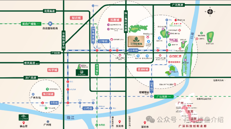 项目构建 321 多维立体交通体系,实现快速接驳广州主城区与湾区各城市,深度融入 1 小时湾区生活圈。高速路网方面,项目约 1.5 公里范围内接驳北三环高速、广河高速、增天高速,其中增天高速建成后可实现 30 分钟直达天河核心区,大幅缩短通勤时长。主干道方面,依托广汕公路、荔新公路两条城市核心通道,可快速通达增城广场、荔城核心、新塘枢纽等区域。轨道交通方面,临近地铁 21 号线,1 站可达增城广场,2 站快线抵达黄埔,5 站快线直达天河,同时规划地铁 16 号线,未来进一步提升轨道交通覆盖能力。新白广城轨通车后可直达白云国际机场,接驳穗莞深城际可通往东莞西站、深圳北站等湾区关键交通节点。三横三纵路网结构与轨道交通、高速路网形成联动,日常通勤、跨城出行、航空出行均有高效选择,满足自住人群通勤与出行全场景需求。