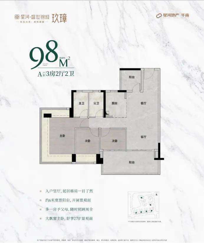 98㎡3室2厅2卫:主朝向朝南,配备270°无柱飘窗,视野开阔,次卧与阳台尺度充足,可满足三口之家的居住需求,目前剩余房源仅个位数。