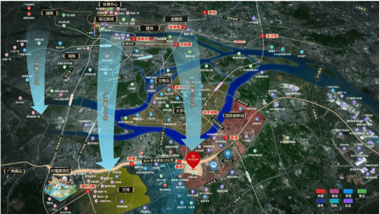 越秀大学星汇城坐落广州番禺国际创新城核心腹地,隶属广州城市第三中轴、南北向科技创新黄金发展轴,同为大学城二期核心宜居片区,承接大学城一期成熟人文底蕴,承接万博 CBD、琶洲、金融城高端产业外溢红利,是广州南部重点规划产城融合高地。板块依托珠江北岸优质岸线资源,以高新技术产业、高校人文科研、滨江生态宜居为核心发展定位,大学城一期开发饱和无新增住宅用地,二期土地稀缺性持续放大,区域长期发展势能强劲,城市界面持续更新升级,市政配套逐年落地完善,属于番禺第二梯队核心宜居板块,汇聚大学城高知人群、琶洲金融白领、万博商务人群、本地改善自住群体,圈层纯粹稳定,人居氛围浓厚,长期房产保值增值能力稳健,是广州南部难得的低密宜居、高成长潜力置业优选板块。板块内汇聚多所高等院校,科研人才密集,科创企业持续入驻落地,产学研一体化发展格局逐步成型,城市发展天花板持续抬高,未来城市配套、商业能级、交通路网、教育品质将全方位进阶,土地稀缺价值与板块成长价值双向加持,奠定项目长久人居价值与资产价值基底。