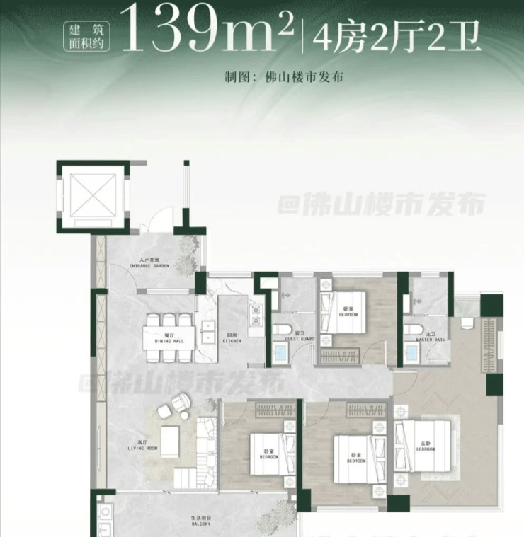 139㎡户型:独梯专户,私密归家;玄关旁设独立生活阳台,实现家务与景观分离;全屋南北对流,16米连续南向采光面贯穿客厅与三大卧室,阳光全天候浸润室内。