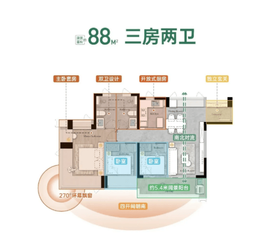 约88㎡三房两卫户型:采用南向布局,保证充足采光与通风,270°观景飘窗设计,拓展室内视野与使用空间。户型布局紧凑合理,动静分区清晰,主卧配备独立卫生间,保障私密性;客餐厅一体化设计,衔接观景阳台,打造开阔公共活动空间,满足三口之家日常居住需求。