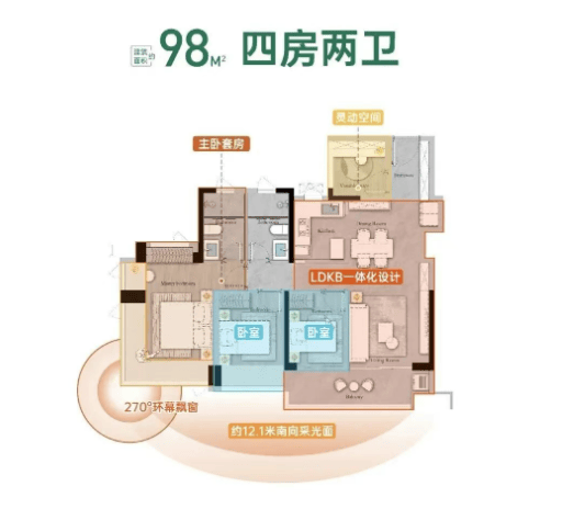 约98㎡四房两卫户型:实现三房变四房的空间魔法,在有限面积内打造全能户型,适合二胎家庭或三代同堂居住。户型同样采用南向设计,LDK餐客一体格局,优化空间动线;书房可灵活改造为儿童房、储物间,满足家庭不同阶段的居住需求,空间实用性拉满。