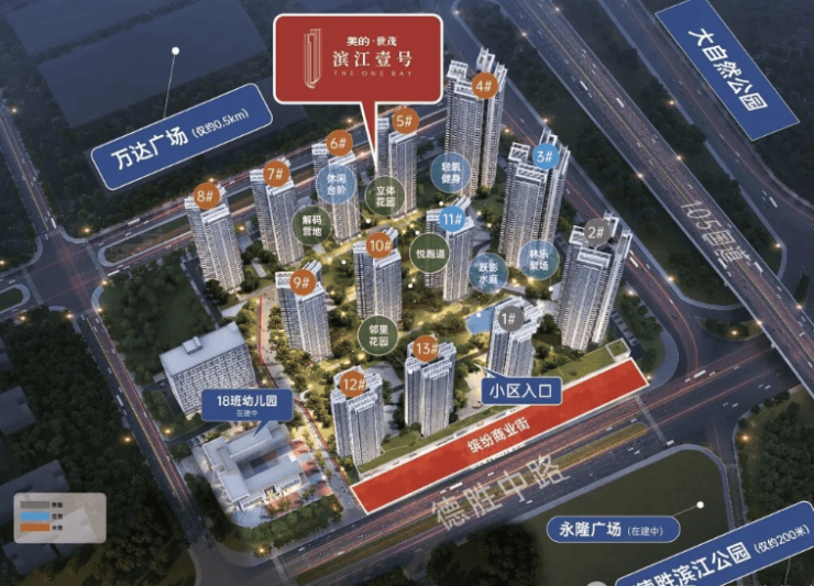 A4: 交通享有地铁11号线(规划)等轨道利好。商业上,距美的万达广场约500米,三大商圈环伺。下楼即达德胜河滨水艺术长廊,生态与商业资源均属顶流。