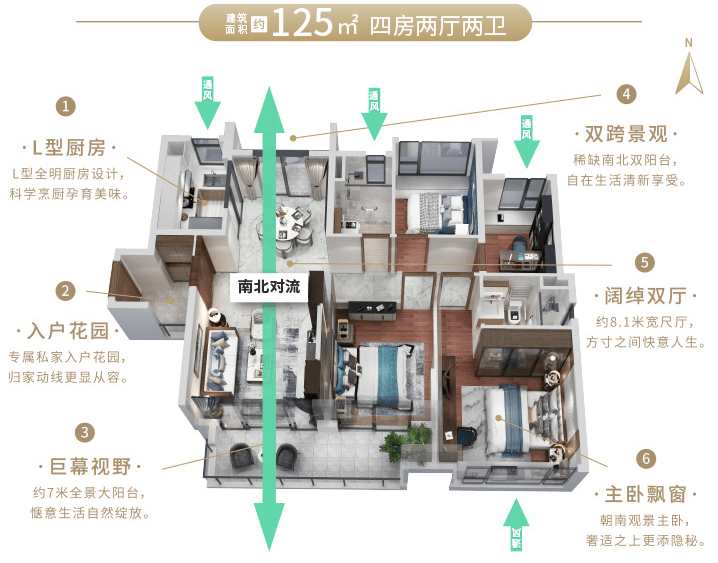 项目主推建面约95-125平方米的三至四房户型,覆盖首置、改善、终改等多层次需求。95平方米三房设计全南向三开间,采光通风俱佳,同时设置私家入户花园,兼具私密与功能。125平方米四房户型则采用南北对流布局,双阳台与大尺度景观阳台相结合,空间通透开阔。无论是小家庭还是大家庭,都能在这里找到契合生活方式的居所。整体户型布局兼顾实用与美感,最大化提升居住体验。