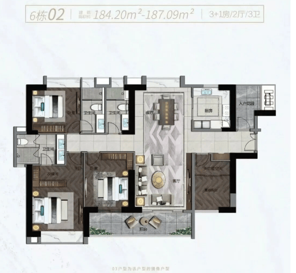 139-143㎡四房两厅三卫:总价约280-320万,单价约2.2-2.4万/㎡,改善优选,主卧套房设计;