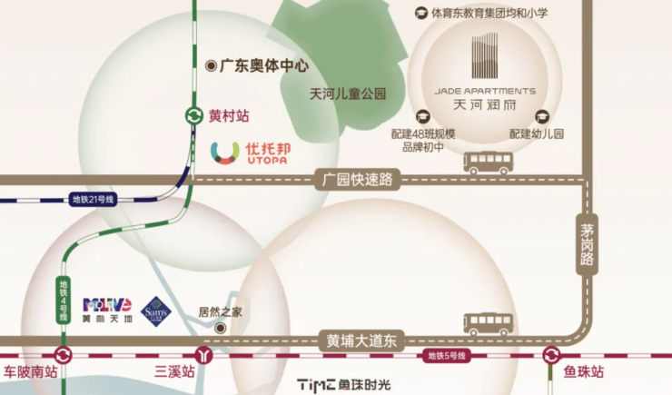 虽现成最近地铁为 13 号线珠村站,但规划中的 19 号线吉山站距项目仅几百米。周边还有 5 号线鱼珠站等多条地铁线路可达。自驾方面,“四横三纵” 交通路网连接广园快速等主干道,车陂南隧道与在建的鱼珠隧道,便捷直通 “珠、金、琶”。同时,规划配建 5 万 m² 公交首末站,1 公里内 9 大公交站超 20 条公交线接驳地铁,交通出行方式多样。