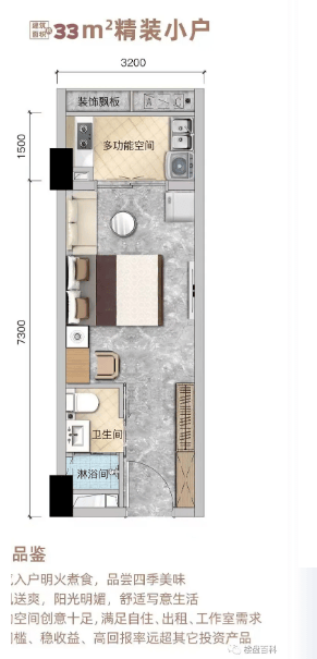 31-45㎡户型为单身公寓户型,户型方正、布局紧凑,空间利用率高,配备独立卫生间、厨房(可明火)、外阳台,通风采光俱佳。该户型面积小巧、总价偏低,总价40来万起,非常适合单身年轻人自住,无需背负沉重房贷,同时也适合投资者布局,周边租金收益可观,出租便捷,投资回报率稳定。