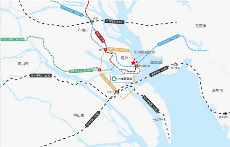 中绿蔚蓝湾享有五维畅达的交通网络,包括两个港口(南沙客运港和南沙邮轮母港)、三条高铁线路(广深港高铁、广中珠高铁和广深磁悬浮高铁)、四条地铁线(4号线、22号线、15号线和32号线)以及四大高速路(莞佛高速、京珠高速、南沙港快速和东新高速)。此外,从项目出发1小时内可达五大国际机场,确保了居民的出行便利性。
