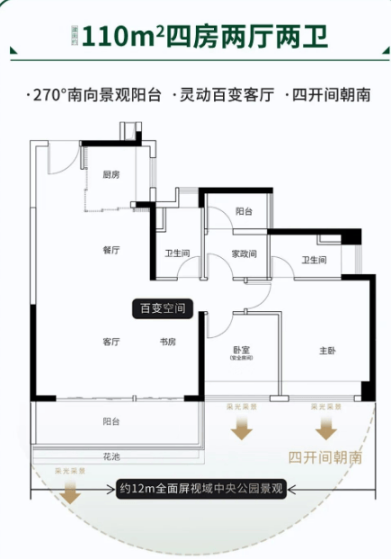 120㎡三房两厅两卫:刚需改善户型,实测 2 梯 2 户板式设计,南北对流,南向面宽达 10.8 米,客厅开间 4.5 米,连接 7 米观景阳台(实测面积约 9.8㎡),主卧套房含独立卫浴与步入式衣帽间,精装交付含西门子厨电,使用率达 90%,适配年轻家庭;