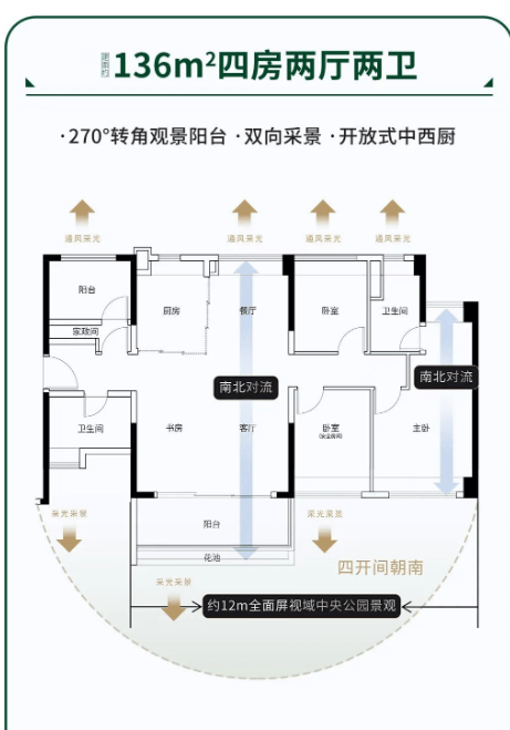 140㎡四房两厅两卫:经典改善户型,实测 2 梯 2 户专梯独户,四开间朝南,南向面宽达 13.2 米,餐客一体化面积超 40㎡,双阳台设计(景观阳台 + 家政阳台,实测总面积约 12.5㎡),主卫配备智能马桶与浴缸,全屋采用全玻璃幕墙,使用率达 91%,满足二胎家庭需求;