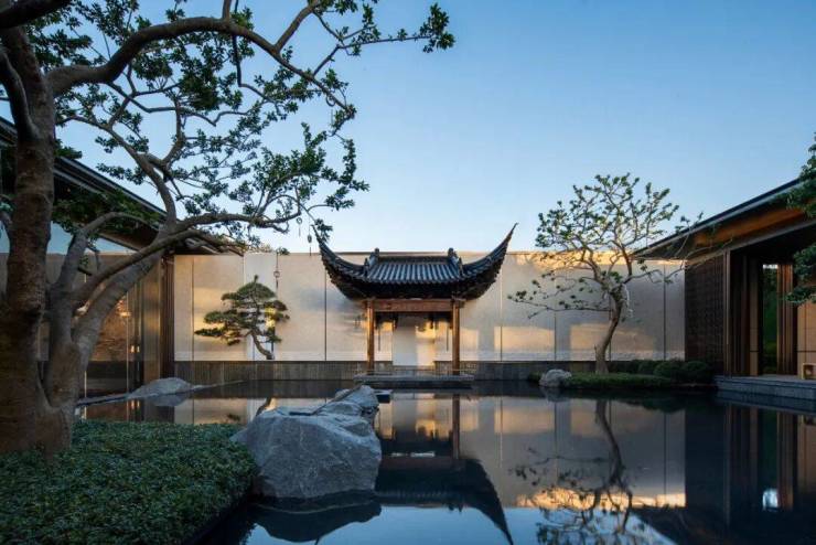 【二进山水轩堂】打造万顷涵碧镜水面,借鉴徽系马头墙建筑风格,有马到功成和守护安家之意。