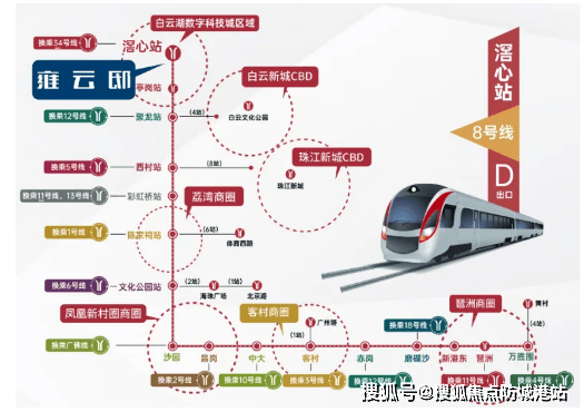 招商・雍云邸位于白云湖数字科技城核心区域,地处白云湖西侧,属于板块内重点发展的新兴产业与人工智能片区,未来发展潜力可观。交通方面,项目出行便捷性突出,步行约 600 米即可抵达地铁 8 号线滘心站,8 号线被誉为 “换乘之王”,贯穿老荔湾、海珠西、客村、琶洲等核心区域,设有 8 个换乘站,可轻松换乘 1 号线、2 号线、3 号线及广佛线,快速通达广州各城区。自驾出行同样便利,周边三高速环绕,接驳内环 35 分钟可畅达天河、海珠、荔湾,还能衔接华快、广佛肇、广清、机场高速等,满足跨城出行需求;此外,可通过聚龙站换乘白云站 TOD(规划 1 轻轨 + 2 高铁 + 7 地铁),未来将实现大湾区便捷串联,交通优势持续升级。