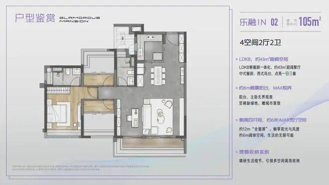 极致的空间扩容——项目首推建面约75㎡三房两卫、82㎡三房两卫、105㎡四房两卫,采用LDKB设计理念,即Living(客厅)、Dining(餐厅)、Kitchen(厨房)和Balcony(阳台)一体化设计,实现了空间的最大化利用。此外,通过“魔法空间”等设计手法,进一步增强了空间的功能性和灵活性,满足不同家庭的需求。