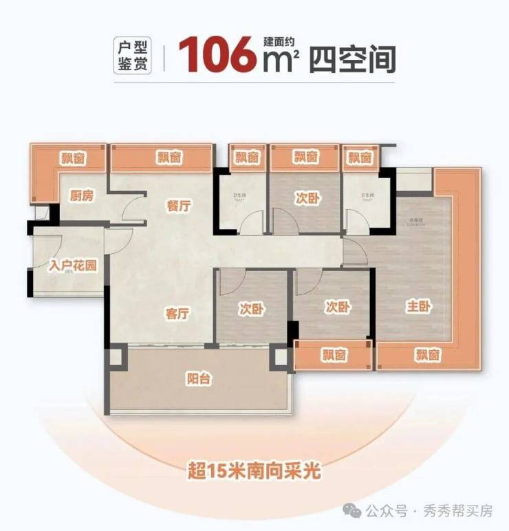 最后是106㎡的四房两卫。作为单边位全明户型,南北通透,南向面宽约15.4米,6.4米超大观景阳台,直望园林+江景。主卧奢阔套间约21-26㎡,环幕飘窗的设计让居住体验拉满。这个户型的开盘去化速度很快,尤其是高区单位,消化得非常快。