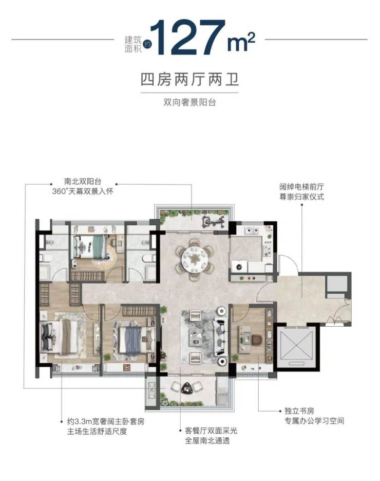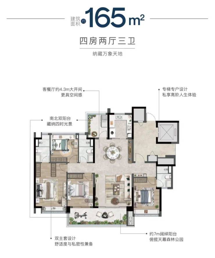 建面约130-145平方米四房两厅两卫:主力奢享户型,空间更为从容。通常拥有横厅或大面宽客厅设计,连接大尺度阳台,引景入室。多个卧室均享有良好采光,主卧套房配置豪华,充分满足多孩家庭或对居住品质有较高要求的改善客群。