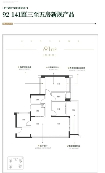 项目主打91-141平方米的三至五房户型,所有户型均为全南向设计,保证了良好的采光和通风条件。部分户型的使用率高达118%,尤其适合追求实用性和空间感的家庭。对于改善型购房者来说,141平方米的五房户型是一个不错的选择,尤其是双主卧的设计更是增加了居住的舒适度。