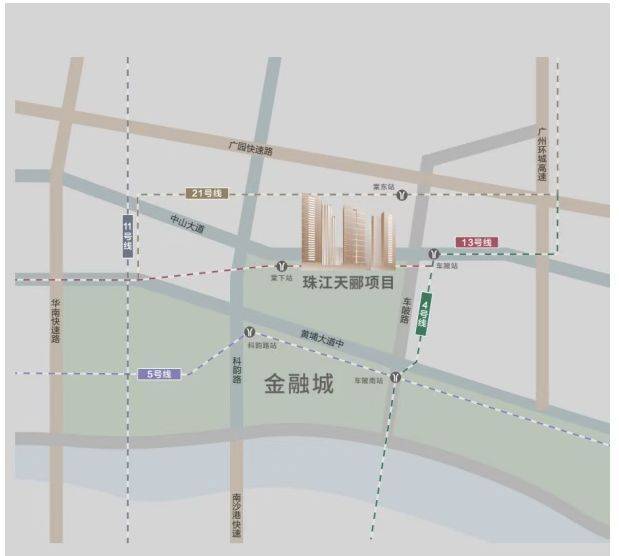 珠江天郦坐拥广州罕见的“3+4+5”超级交通体系:3条城市主干道(中山大道、黄埔大道、科韵路)、4条高速路网(环城高速、华南快速、广园快速、南沙港快速)以及5条地铁线路环绕(4、5、11、13、21号线)。其中,项目紧邻地铁13号线二期棠下站(已于2024年正式通车),步行可达。通过该线,10分钟直达金融城综合交通枢纽。更值得关注的是,金融城站未来将整合4条地铁、3条新型交通线及广佛环线城轨,并设专属值机大厅,实现“地铁+航空”无缝衔接——前往广州南站仅需10分钟,白云机场约20分钟。这种高效通勤能力,在全广州住宅项目中实属罕见。